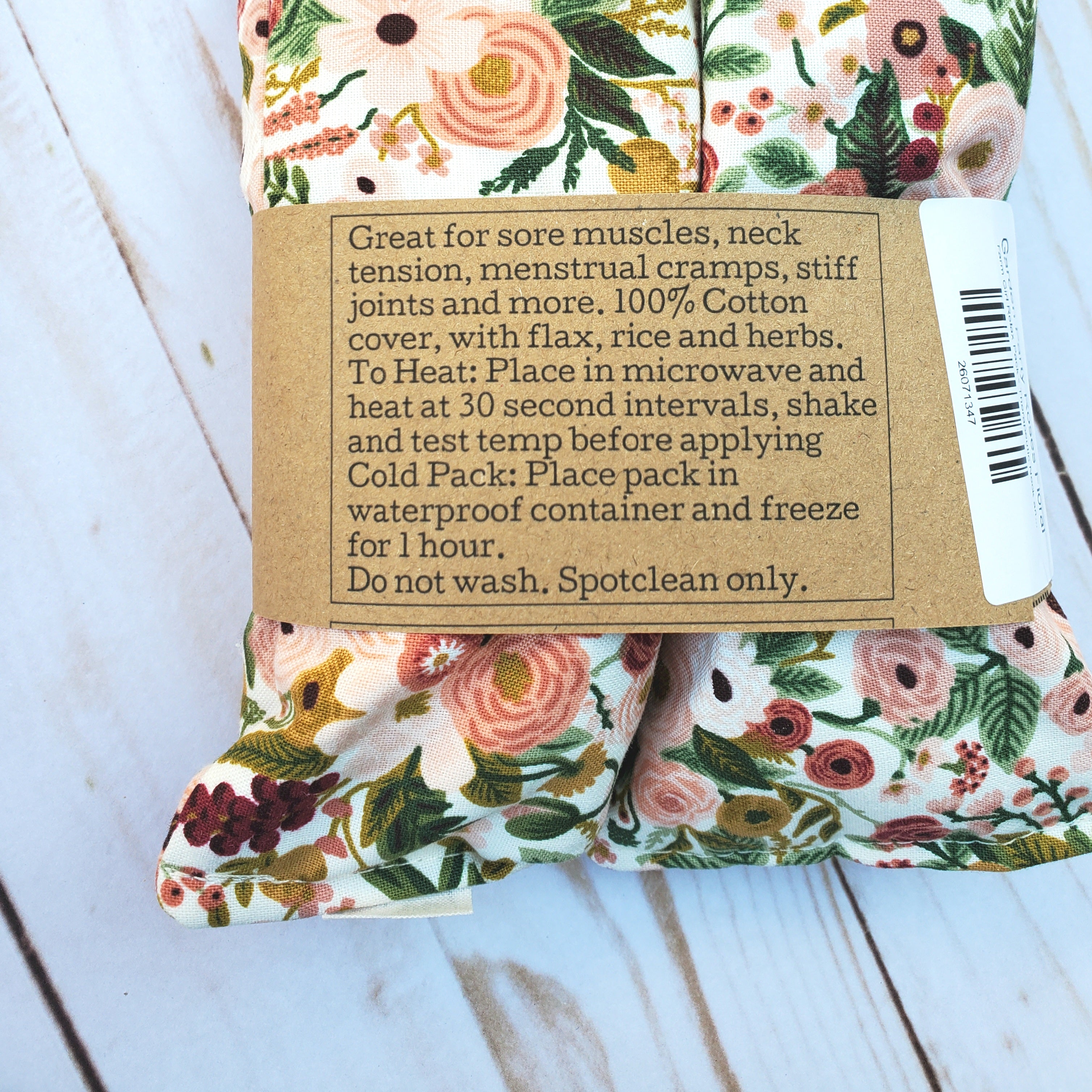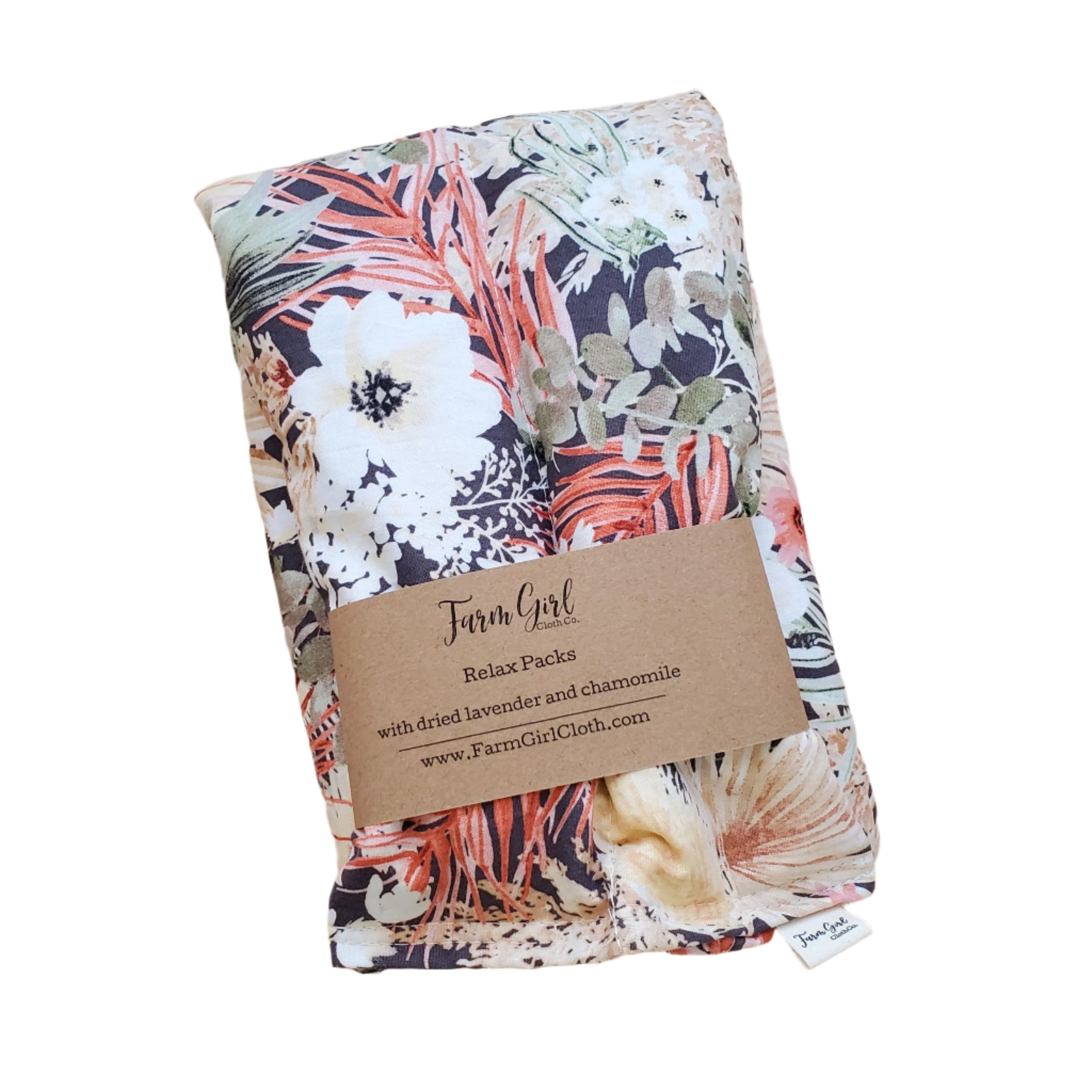 Las compresas relajantes Farm Girl tienen una funda 100 % algodón, rellena con más de 900 g de arroz y lino orgánicos y hierbas secas. Mide aproximadamente 18 x 48 cm.
