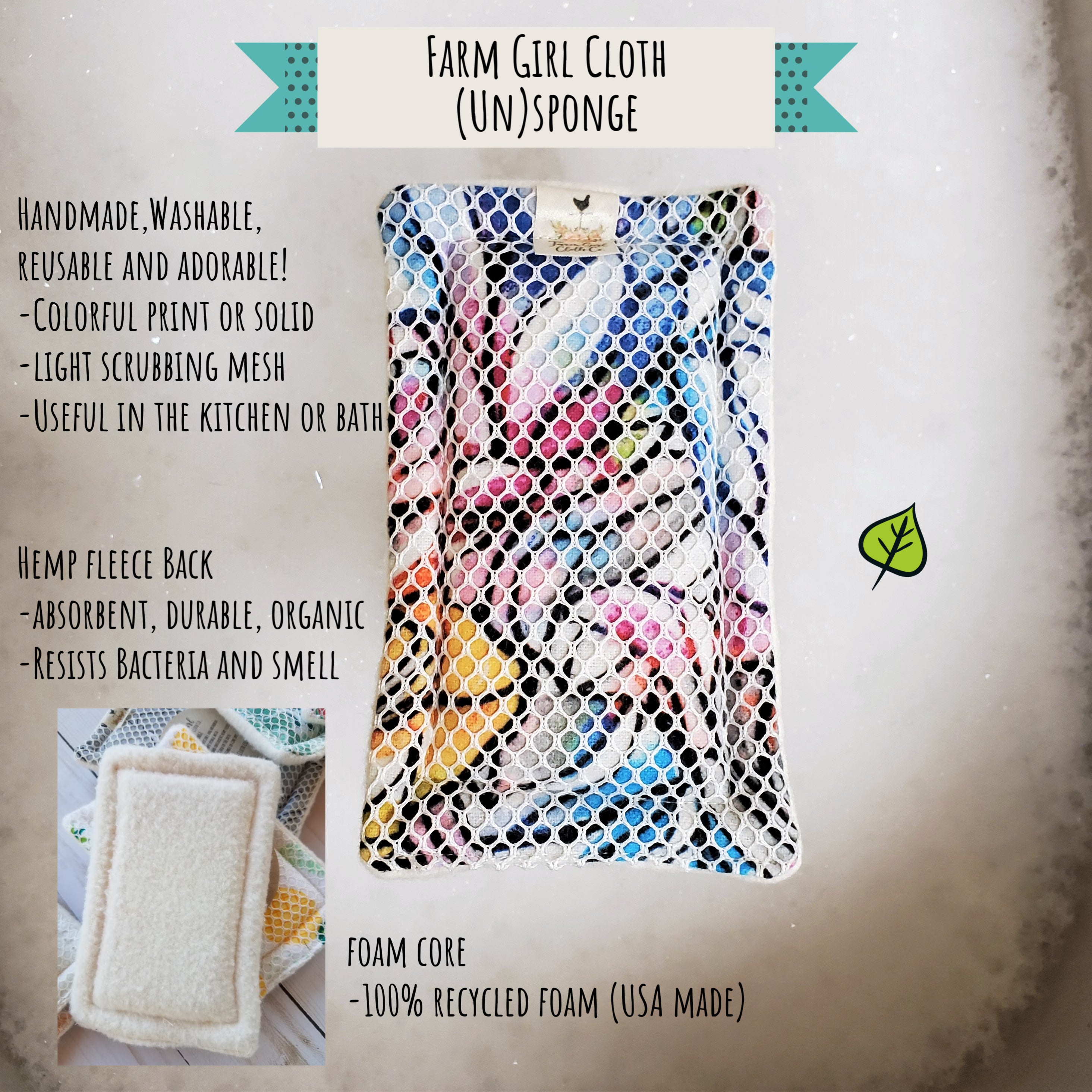 Las esponjas sin papel Farm Girl están hechas a mano con materiales de alta calidad en lindos patrones. Hechas de vellón de cáñamo/algodón orgánico para una alta absorción y una superficie de lavado suave (¡naturalmente antibacteriana!), una fina capa de espuma ecológica reciclada para absorber y hacer espuma, estampado de franela o algodón para mayor absorción y color, y una cubierta de malla para un fregado suave. Mide aproximadamente 14 x 10 cm y se adapta perfectamente a la mano, además de caber en tazones y tazas con facilidad. ¡Ten cuidado con los cuchillos y objetos afilados que podrían cortar la esponja!